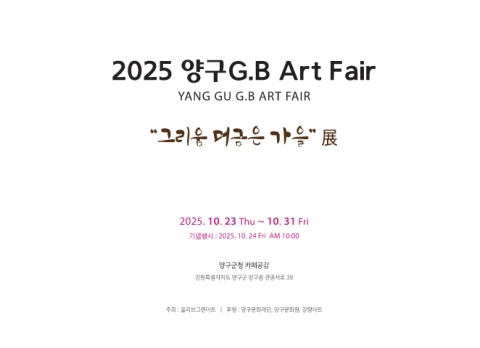 2025 양구G.B Art Fair YANG GU G.B ART FAIR “그리움 머금은 가을” 展 2025. 10. 23 Thu ~ 10. 31 Fri 기념행사 : 2025. 10. 24 Fri AM 10:00 양구군청 카페공감 강원특별자치도 양구군 양구읍 관공서로 38 주최 : 올리브그린아트 ㅣ 후원 : 양구문화재단, 양구문화원, 강령아트