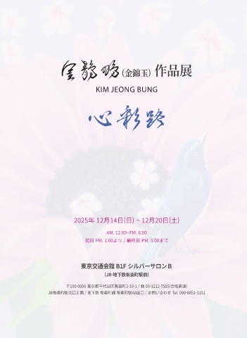 (金錦玉) 作品展 KIM JEONG BUNG 2025年 12月14日(日) ~ 12月20日(土) AM. 11:00~PM. 6:00 初日 PM. 1:00よリ / 最終日 PM. 5:00まで 東京交通会館 B1F シルバーサロンB (JR·地下鉄有楽町駅前) 〒100-0006 東京都千代田区有楽町2-10-1 / ☎ 03-3212-7505(会場直通) JR有楽町駅北口正面 / 地下鉄 有楽町線 有楽町駅A8出口 / お問い合わせ Tel. 090-8851-3151