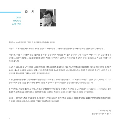 오늘 「2025 제2회 원주아트페어」의 개막을 진심으로 축하드립니다. 아울러 바쁜 일정에도 함께해 주신 모든 분들께 깊이 감사드립니다.