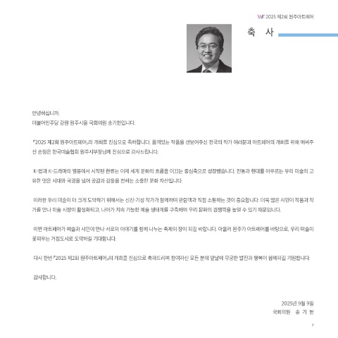 다시 한번 『2025 제2회 원주아트페어』의 개최를 진심으로 축하드리며 참여하신 모든 분의 앞날에 무궁한 발전과 행복이 함께하길 기원합니다.