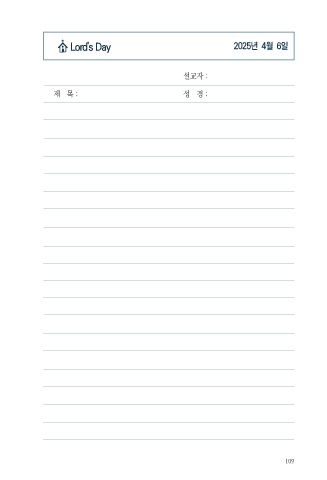 Lord's Day 2025년 4월 6일 설교자 : 제 목 : 성 경 : 109