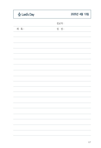 Lord's Day 2025년 4월 13일 설교자 : 제 목 : 성 경 : 127