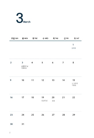3 March 주일 SUN 월 MON 화 TUE 수 WED 목 THU 금 FRI 토 SAT 1 삼일절 2 3 4 5 6 7 8 납세자의 날 대체휴일 9 10 11 12 13 14 15 3.15의거 기념일 16 17 18 19 20 21 22 상공의 날 춘분 23 24 25 26 27 28 29 30 31 2