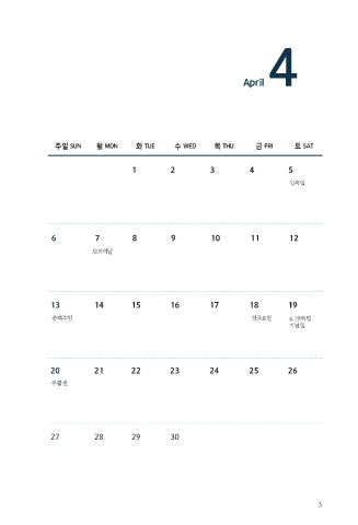 4 April 주일 SUN 월 MON 화 TUE 수 WED 목 THU 금 FRI 토 SAT 1 2 3 4 5 식목일 6 7 8 9 10 11 12 보건의날 13 14 15 16 17 18 19 종려주일 성금요일 4.19혁명 기념일 20 21 22 23 24 25 26 부활절 27 28 29 30 3