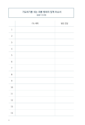 기도하기를 쉬는 죄를 범하지 않게 하소서 (삼상 12:23) 기도 제목 받은 응답 1 2 3 4 5 6 7 8 9 10 11 12 13 14 4
