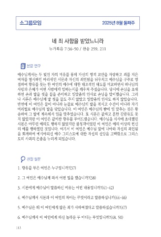 송하여 그 발에 계속해서 입을 맞추었습니다. 또 시몬은 값싸고 흔한 감람유도 붓