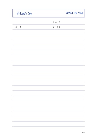 Lord's Day 2025년 8월 24일 설교자 : 제 목 : 성 경 : 155