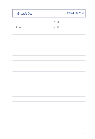 Lord's Day 2025년 8월 31일 설교자 : 제 목 : 성 경 : 173