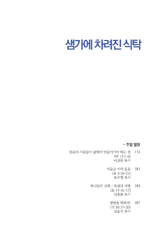 샘가에 차려진 식탁 - 주일 말씀 믿음의 사람들이 삶에서 만들어가야 하는 것 174 (히 13:1-6) 이상문 목사 거듭난 자의 믿음 181 (요 3:16-21) 유우열 목사 하나님의 선택 - 특권과 사명 183 (요 15:16-17) 심종훈 목사 생명을 택하라! 187 (신 30:15-20) 김윤석 목사