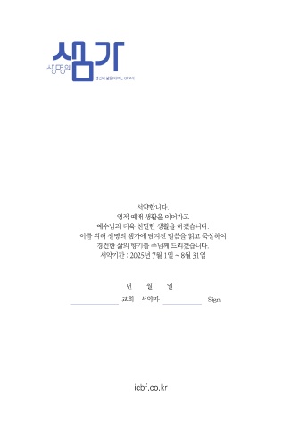 서약합니다. 영적 예배 생활을 이어가고 예수님과 더욱 친밀한 생활을 하겠습니다. 이를 위해 생명의 샘가에 담겨진 말씀을 읽고 묵상하여 경건한 삶의 향기를 주님께 드리겠습니다. 서약기간 : 2025년 7월 1일 ~ 8월 31일 년 월 일 교회 서약자 Sign icbf.co.kr