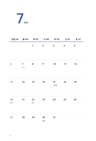 7 July 주일 SUN 월 MON 화 TUE 수 WED 목 THU 금 FRI 토 SAT 1 2 3 4 5 6 7 8 9 10 11 12 소서 13 14 15 16 17 18 19 제헌절 20 21 22 23 24 25 26 초복 대서 27 28 29 30 31 중복 2