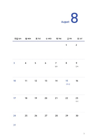 8 August 주일 SUN 월 MON 화 TUE 수 WED 목 THU 금 FRI 토 SAT 1 2 3 4 5 6 7 8 9 입추 말복 10 11 12 13 14 15 16 광복절 17 18 19 20 21 22 23 처서 24 25 26 27 28 29 30 31 3