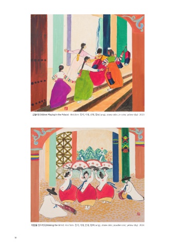 궁놀이(Children Playing in the Palace) 46x53cm 장지, 석채, 진채, 황토(Jangji, stone color, jin color, yellow clay) 2023 바람을 일으키다(Making the Wind) 61x73cm 장지, 석채, 분채, 황토(Jangji, stone color, powder color, yellow clay) 2024 10