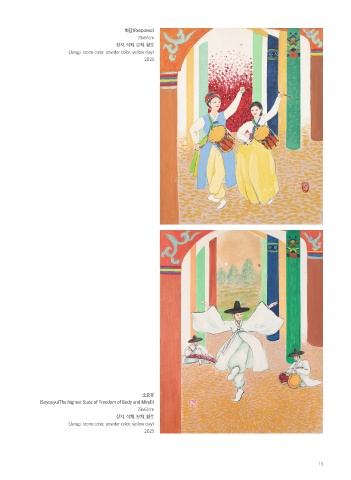 화답(Response) 73x61cm 장지, 석채, 분채, 황토 (Jangji, stone color, powder color, yellow clay) 2025 소요유 (Soyouyu(The highest State of Freedom of Body and Mind)) 73x61cm 장지, 석채, 분채, 황토 (Jangji, stone color, powder color, yellow clay) 2025 13