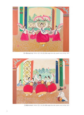 봄 노래(Spring Song) 73x91cm 장지, 석채, 분채, 황토(Jangji, stone color, powder color, red clay) 2023 한 마음(One Heart) 73x91cm 장지, 석채, 분채, 황토(Jangji, stone color, powder color, red clay) 2023 4