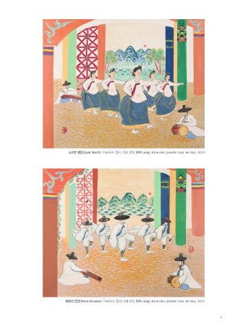 고요한 행진(Quiet March) 73x91cm 장지, 석채, 분채, 황토(Jangji, stone color, powder color, red clay) 2023 평화의 전진(Peace Advance) 73x91cm 장지, 석채 분채, 황토(Jangji, stone color, powder color, red clay) 2023 7