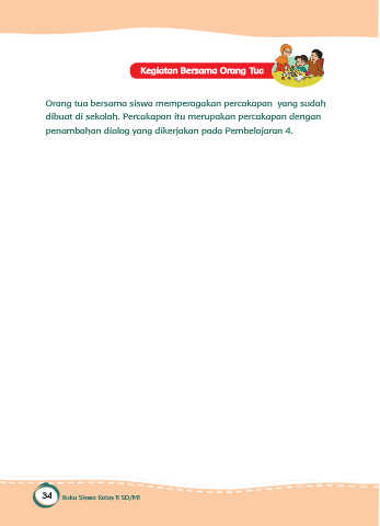 Kegiatan Bersama Orang Tua Orang tua bersama siswa memperagakan percakapan yang sudah dibuat di sekolah. Percakapan itu merupakan percakapan dengan penambahan dialog yang dikerjakan pada Pembelajaran 4. 34 Buku Siswa Kelas II SD/MI