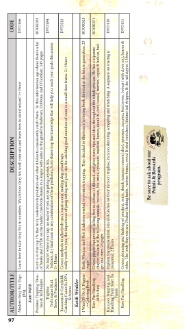 AUTHOR/TITLE Modern Gray Fox Trap- ping Scott Welch Predator Trapping Theo- ries & Techniques Trapline Techniques Mud, Snow, & Predators Raccoons & Cornfields Catching Coons In DP's & Snares Keith Winkler I Want To Be A Trapper = Coloring Book Raw Fur Handling At Its Best Raccoon Trapping And