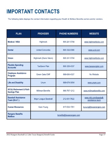 2023 Rangers Baseball LLC (the Texas Rangers) Benefit Guide Page 17