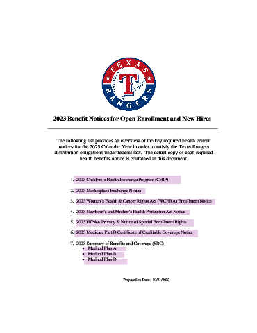 notices for the 2023 Calendar Year in order to satisfy the Texas Rangers