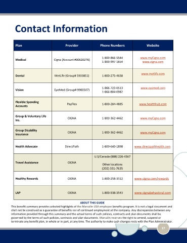 This benefit summary provides selected highlights of the Marcolin USA employee benefits program. It is not a legal document and