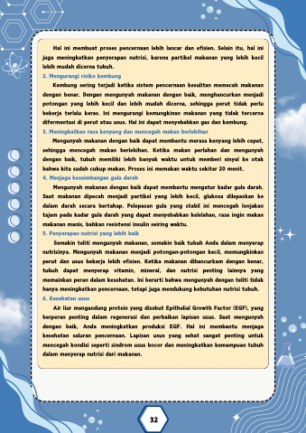 Air liur mengandung protein yang disebut Epithelial Growth Factor (EGF), yang berperan penting dalam regenerasi dan perbaikan lapisan usus. Saat mengunyah dengan baik, Anda meningkatkan produksi EGF. Hal ini membantu menjaga kesehatan saluran pencernaan. Lapisan usus yang sehat sangat penting untuk mencegah kondisi seperti sindrom usus bocor dan meningkatkan kemampuan tubuh