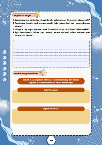 1.Bagaimana ragi bertindak sebagai katalis dalam proses fermentasi adonan roti? 2.Bagaimana jumlah ragi mempengaruhi laju fermentasi dan pengembangan