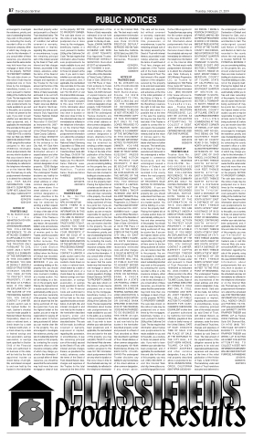 described property under and pursuant to a Deed of Trust described below. The sale will be made in an "as is" condition, but without covenant or warranty, expressed or implied, regarding title, possession, or encumbrances, to pay the remaining principal sum of the note(s) secured by the Deed of Trust, with interest and late charges thereon, as provided in the note(s), advances, under the terms of the Deed of Trust, interest thereon, fees, charges and expenses of the Trustee for the total amount (at the time of the initial publication of the Notice of Sale) reasonably estimated to be set forth below. The amount may be greater on the day of sale. Trustor: Jose Luis Martinez and Beatriz Martinez, husband and wife as joint tenants Duly Appointed Trustee: National Default Servicing Corporation Recorded 01/26/2007 as Instrument No. 2007- 0009015 (or Book, Page) of the Official Records of Tulare County, California. Date of Sale: 03/08/2019 at 2:00 PM Place of Sale: At the entrance to the City Hall, 411 East Kern Avenue, Tulare, CA 93274 Estimated amount of unpaid balance and other charges: $187,017.26 Street Address or other commondesignationofreal property: 12335 Badger Avenue, Orosi, CA 93647 The undersigned Trustee disclaims any liability for any incorrectness of the street address or other common designation, if any, shown above. If no street address or other common designation is shown, directions to the location of the property may be obtained by sending a written request to the beneficiary within 10 days of the date of first publication of this Notice of Sale. If the Trustee is unable to convey title for any reason, the successful bidder's sole and exclusive remedy shall be the return of monies paid to the Trustee, and the successful bidder shall have no further recourse. The requirements of California C i v i l C o d e S e c t i o n 2923.5(b)/2923.55(c) were fulfilled when the Notice of Default was recorded. NOTICE TO POTENTIAL BIDDERS: If you are considering bidding on this property lien, you should understand that there are risks involved in bidding at a trustee auction. You will be bidding on a lien, not on the property itself. Placing the highest bid at a trustee auction does not automatically entitle you to free and clear ownership of the property. You should also be aware that the lien being auctioned off may be a junior lien. If you are the highest bidder at the auction, you are or may be responsible for paying off all liens senior to the lien being auctioned off, before you can receive clear title to the property. You are encouraged to investigate the existence, priority, and size of outstanding liens that may exist on this property by contacting the county recorder's office or a title insurance company, either of which may charge you a fee for this information. If you consult either of these resources, you should be aware that the same lender may hold more than one mortgage or deed of trust
