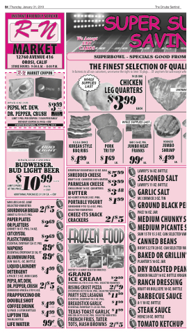 SUPERBOWL - SPEciaLS GOOd FROm THE FINEST SELECTION OF OF QUALITY IN In fairness to to to all our customers we reserve the right to to to limit 10 pkgs OF OF any item for sale except where to to to or to to to all OROSI CALIF