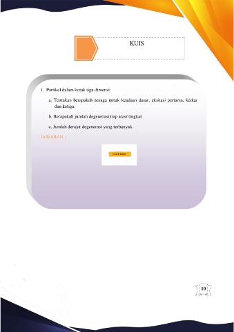 KUIS 1. Partikel dalam kotak tiga dimensi: a. Tentukan berapakah tenaga untuk keadaan dasar, eksitasi pertama, kedua dan ketiga. b. Berapakah jumlah degenerasi tiap aras/ tingkat c. Jumlah derajat degenerasi yang terbanyak. JAWABAN : 10