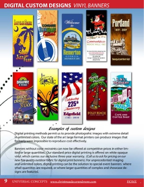 DIGITAL CUSTOM DESIGNS VINYL BANNERS SCREEN PRINT STOCK SPRING & SUMMER 9 UNIVERSAL CONCEPTS www.christmasdecorandmore.com HOME call 800.522.0718 or email sales@universalconceptsus.com 10