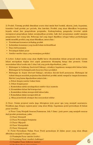 4) Pasar. Dalam proposal usaha juga ditetapkan jenis pasar apa yang menjadi sasarannya.