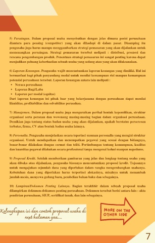 5) Persaingan. Dalam proposal usaha menyebutkan dengan jelas dimana posisi perusahaan