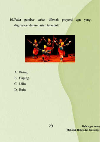 10. Pada gambar tarian dibwah properti apa yang digunakan dalam tarian tersebut? A. Piring B. Caping C. Lilin D. Bulu 29 Hubungan Antar Makhluk Hidup dan Ekosistem