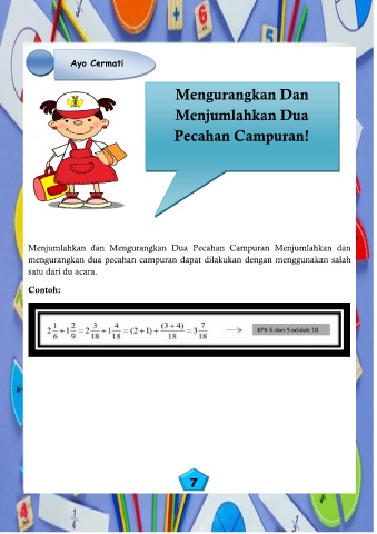 Ayo Cermati Mengurangkan Dan Menjumlahkan Dua Pecahan Campuran! Menjumlahkan dan Mengurangkan Dua Pecahan Campuran Menjumlahkan dan mengurangkan dua pecahan campuran dapat dilakukan dengan menggunakan salah satu dari du acara. Contoh: 7