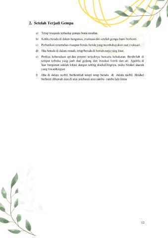 b) Ketika berada di dalam bangunan, evakuasi diri setelah gempa bumi berhenti.