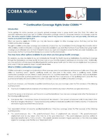 Plan. This notice explains COBRA continuation coverage, when it may become available to you and your family, and what you