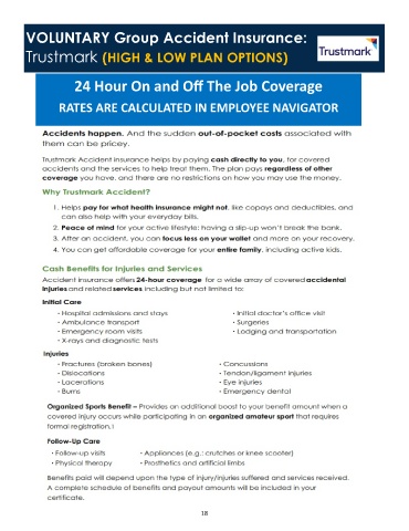 VOLUNTARY Group Accident Insurance: Trustmark (HIGH & LOW PLAN OPTIONS) 24 Hour On and Off The Job Coverage RATES ARE CALCULATED IN EMPLOYEE NAVIGATOR 18