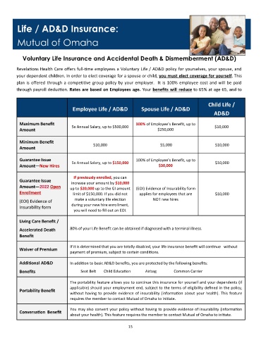 Revelations Health Care offers full-time employees a Voluntary Life / AD&D policy for yourselves, your spouse, and