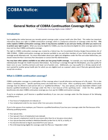 information about your right to COBRA continuation coverage, which is a temporary extension of coverage under the Plan. This