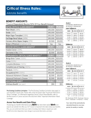 Critical Illness Rates: Allstate Benefits Your rate will be automatically calculated based on your pay- period, bi-weekly or weekly. 20
