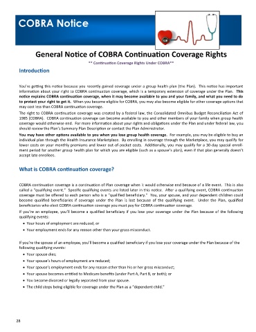 information about your right to COBRA continuation coverage, which is a temporary extension of coverage under the Plan. This