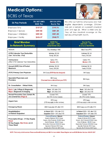 NOTE: This is only a brief overview. Please see Benefit Summary and SBC for more details. Please Register and use BCBS Member Services: 800-521-2227