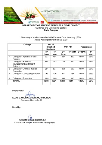 Summary of students enrolled with Personal Data Inventory (PDI)