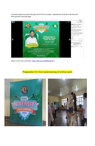 The online event was aired through the IFSU Potia Campus- Department of Student Services and development Facebook page. Watch Career Day Link Video: https://fb.watch/46MhDMT40_/ Preparation for the Livestreaming of online event