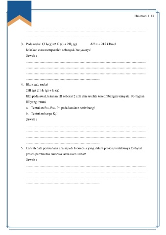 3. Pada reaksi CH4 (g) ⇄ C (s) + 2H2 (g) ∆ = + 215 kJ/mol