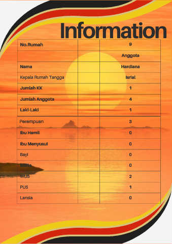 Information No.Rumah 9 Anggota Nama Hardiana Kepala Rumah Tangga Isrial Jumlah KK 1 Jumlah Anggota 4 Laki-Laki 1 Perempuan 3 Ibu Hamil 0 Ibu Menyusui 0 Bayi 0 Balita 0 WUS 2 PUS 1 Lansia 0