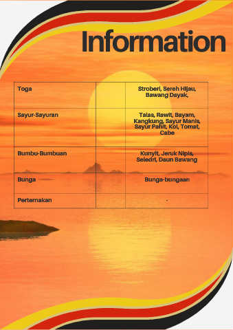 Information Toga Stroberi, Sereh Hijau, Bawang Dayak, Sayur-Sayuran Talas, Rawit, Bayam, Kangkung, Sayur Manis, Sayur Pahit, Kol, Tomat, Cabe Bumbu-Bumbuan Kunyit, Jeruk Nipis, Seledri, Daun Bawang Bunga Bunga-bungaan Perternakan -