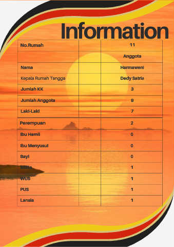 Information No.Rumah 11 Anggota Nama Harmaweni Kepala Rumah Tangga Dedy Satria Jumlah KK 3 Jumlah Anggota 9 Laki-Laki 7 Perempuan 2 Ibu Hamil 0 Ibu Menyusui 0 Bayi 0 Balita 1 WUS 1 PUS 1 Lansia 1