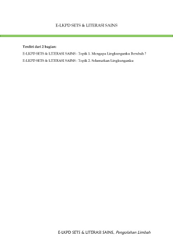 E-LKPD SETS & LITERASI SAINS Terdiri dari 2 bagian: E-LKPD SETS & LITERASI SAINS : Topik 1. Mengapa Lingkunganku Berubah ? E-LKPD SETS & LITERASI SAINS : Topik 2. Selamatkan Lingkunganku E-LKPD SETS & LITERASI SAINS, Pengolahan Limbah